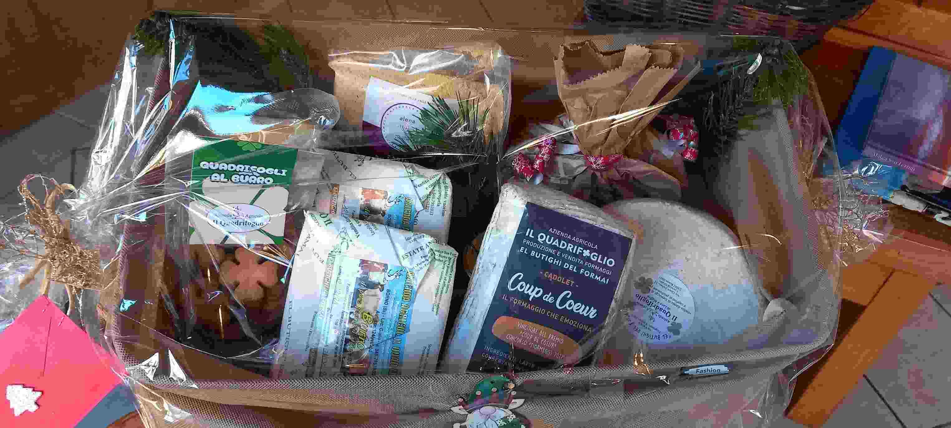 Esempio1: casetta in cartone con manici per il trasporto con 500 gr di stracchino, 500 gr di formaggella, 500 gr di formaggio Malga San Fermo e 500 gr di formaggio di grotta ad euro 35